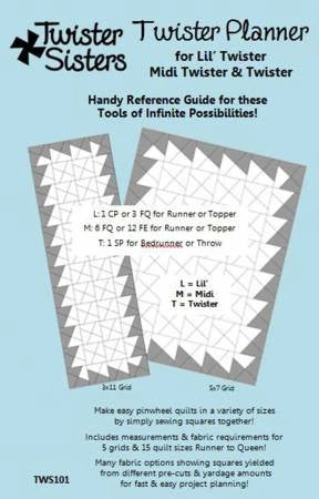 Plan your own twister quilt with this handy reference guide for the Lil’ Twister, Midi Twister and Twister tools. This planner includes measurements and fabric requirements for 5 grids and 15 quilt sizes, from runner to queen. Use the guide to determine how to use fabric pre-cuts and/or yardage for fast and easy project planning and kitting. Ifi you are unfamiliar with how these amazing tools are used to make fun and easy pinwheel quilts by simply sewing squares together.