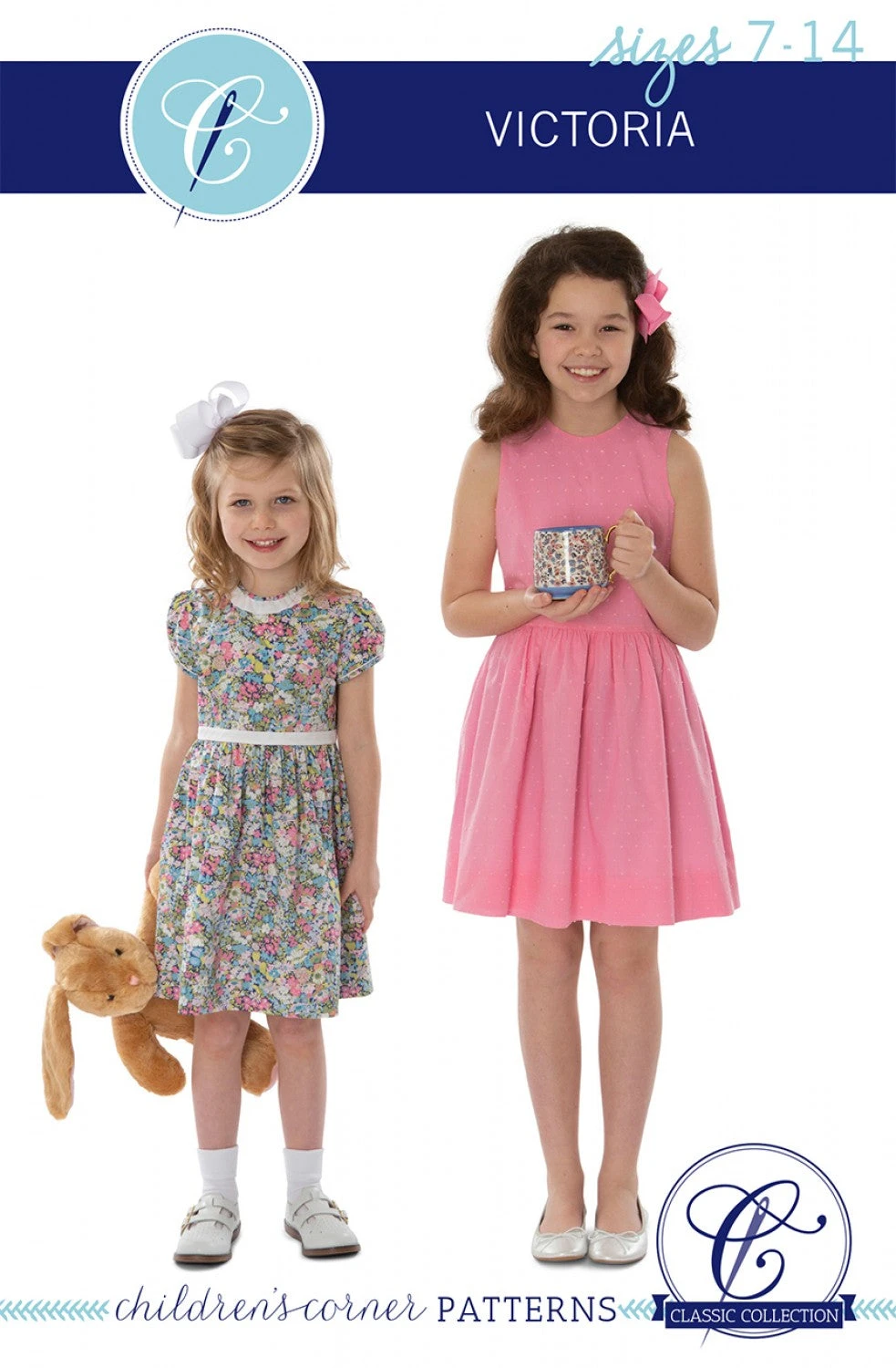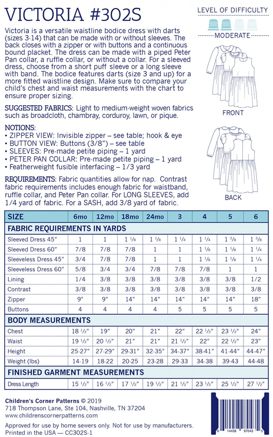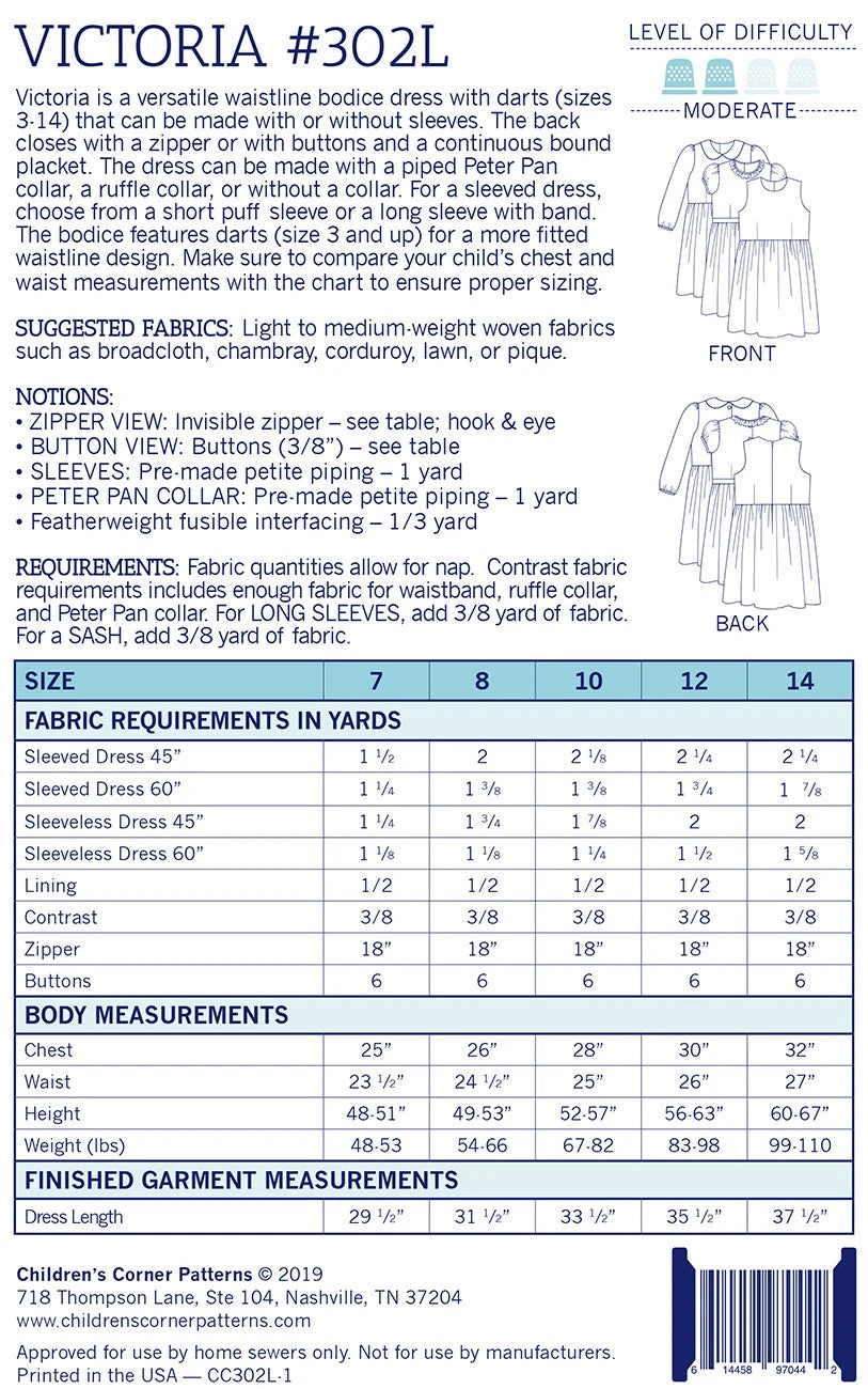 Victoria is a versatile waistline bodice dress with darts (sizes 3-14) that can be made with or without sleeves. The back closes with a zipper or with buttons and a continuous bound placket. The dress can be made with a piped Peter Pan collar, a ruffle collar, or without a collar. For a sleeved dress, choose from a short puff sleeve or a long sleeve with band. The bodice features darts (size 3 and up) for a more fitted waistline design. Make sure to compare your child’s chest and waist measurements with the chart to ensure proper sizing.