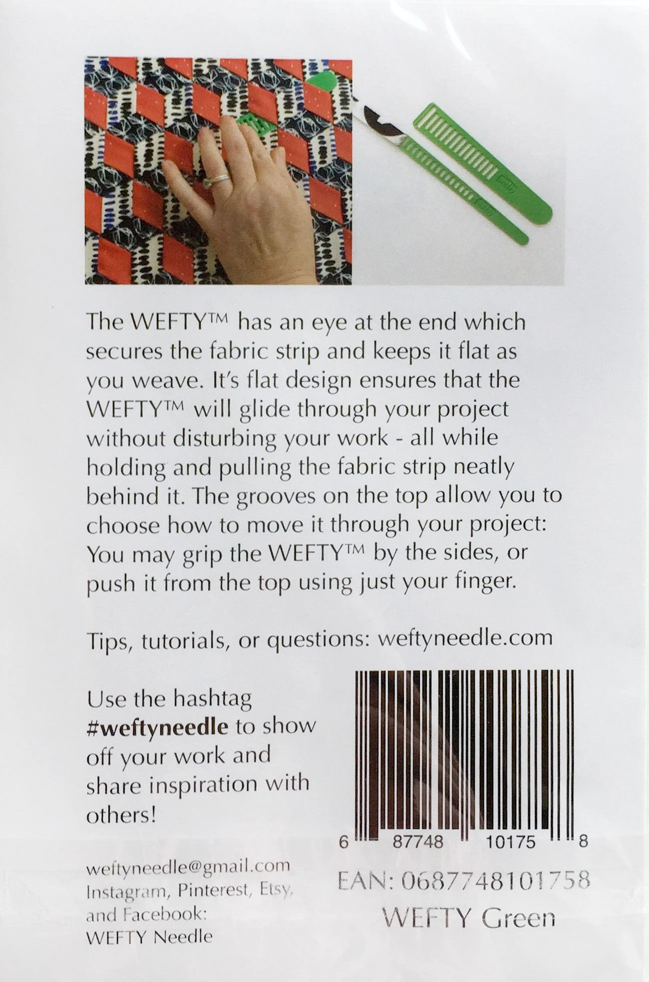 Designed specifically for weaving fabric strips, the WEFTY allows you to build your own unique textiles, produce tighter weave designs, and reduce wear and tear on your hands. The WEFTY has an eye at the end which secures the fabric strip and keeps it flat as you weave. It’s flat design ensures that the WEFTY will glide through your project without disturbing your work – all while holding and pulling the fabric strip neatly behind it. The grooves on the top allow you to choose how to move it through your project: you may grip the WEFTY by the sides or push it from the top using just your finger. Two sizes included, both are 5.5″ long.