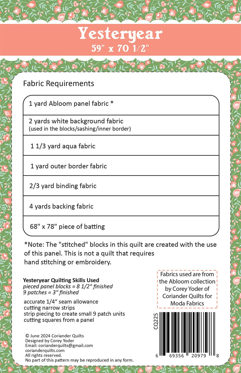 Yesteryear is a full color booklet style pattern. It features the Abloom fabric collection by Corey Yoder of Coriander Quilts for Moda Fabrics. The panel from the Abloom collection is utilized. Yesteryear finishes at 59″ x 70 1/2″.